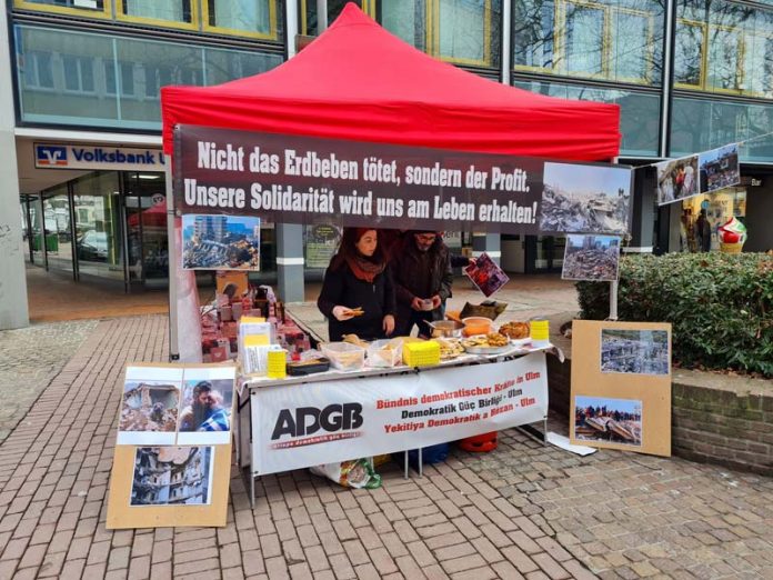 Avrupa Demokratik Güç Birliği (ADGB) Ulm Bileşenleri ADHF, AGİF, ATİF, FED-GEL ve HDP’li aktivistler şehir merkezinde “Öldüren deprem değil, kârdır. Dayanışmamız bizi yaşatacak!” mottosuyla yapılan etkinlikte ADGB ve Heyva Sor’un pankartı açılırken, deprem alanından çok sayıda fotoğraf da sergilendi.