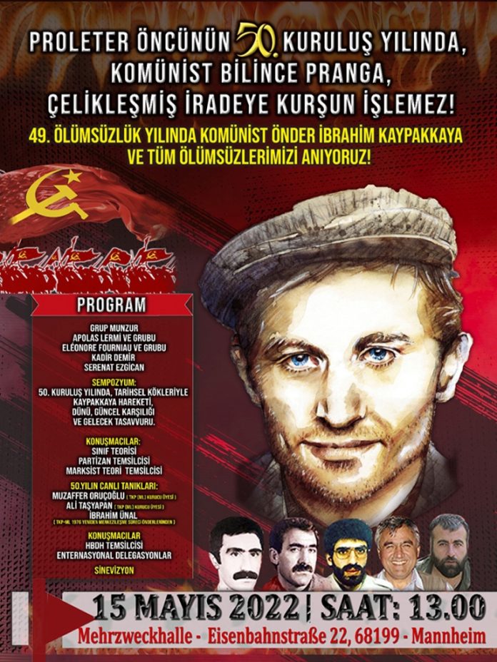 Proletarya partisinin kurucusu komünist önder İbrahim Kaypakkaya şahsında, devrim davasında yitirilen parti ve devrim ölümsüzlerini anmak için, Almanya’nın Mannheim kentinde, 15 Mayıs 2022 tarihinde etkinlik düzenlendi.