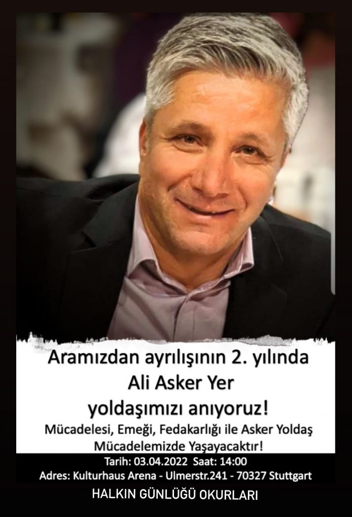Ağır bir iş cinayeti sonucu 07.04.2020 tarihinde aramızdan ayrılan Ali Asker Yer yoldaşımızı pandemi koşullarından dolayı, anmasını gerçekleştiremedik. Asker yoldaş bölgemizde örnek bir devrimci, fedakâr, mücadele azmiyle kitlelere önderlik eden devrimci bir yoldaşımızdı. Özgür, sınırsız ve sınıfsız bir dünya düşü ile, zamansız aramızdan ayrılan Asker yoldaşı anıyoruz.