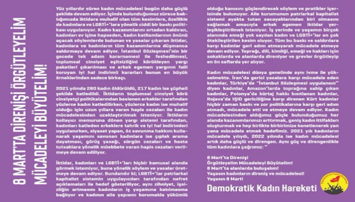 8 Mart Dünya Emekçi Kadınlar Günü bu yılda Türkiye-Kuzey Kürdistan’ın dört bir yanında yapılacak olan yürüyüş ve etkinliklerle karşılanacak. Kadın kurumları yaptıkları açıklamalar ve çağrılarla “Yoksulluğa, şiddete, sömürüye karşı mücadelemizi büyütüyoruz” şiarıyla ülke genelinde sokaklarda olacaklarını belirttiler. Demokratik Kadın Hareketi ‘de yazılı bir açıklama yaparak başta emekçi kadınlar olmak üzere tüm kadınları 8 Mart’ta sokaklara çıkmaya çağırdı.