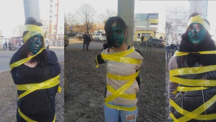 Yayınlanan fotoğraflarda, savaştan kaçan roman kadınların, Ukrayna askeri üniforması giymiş bir kişinin gözetiminde sarı bantlarla direklere bağlandığı ve yüzlerine yeşil boyalar sürüldüğü görüldü.