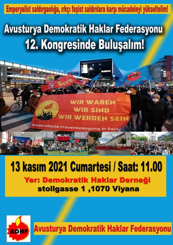 ADHF (Avusturya Demokratik Haklar Federasyonu) 13 Kasım Cumartesi günü Viyana Demokratik Haklar Derneği lokalinde 12. Kongresini Gerçekleştirecek.