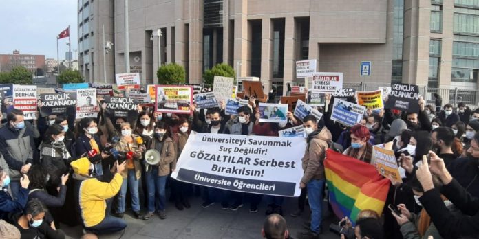 Boğaziçi Üniversitesi öğrencileri, Çağlayan Adliyesi önünde bir araya gelerek basın açıklaması düzenledi. Yapılan açıklamada; “Baskılarınızla, tutuklamalarınızla gençliği yıldıramazsınız.” ifadelerini kullanarak gözaltında tutulan öğrencilerin bir an önce serbest bırakılması çağrısında bulundular.