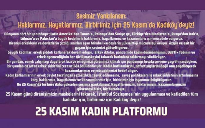 25 Kasım Kadın Platformu yaptığı açıklama ile 25 Kasım Kadına Yönelik Şiddete Karşı Uluslararası Mücadele ve Dayanışma Günü’nde Kadıköy’de olacağını duyurdu