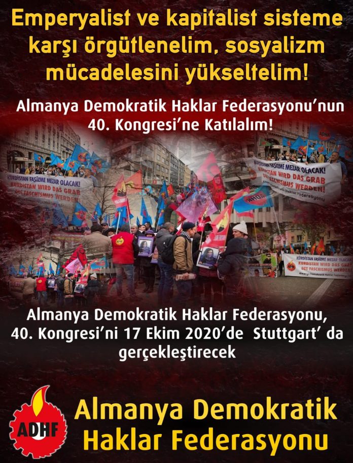 Almanya Demokratik Haklar Federasyonu, 40. Kongresini 17 Ekim 2020' de Stuttgart'ta gerçekleştirecektir.