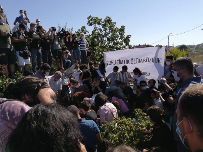 HABER MERKEZİ (28-08-2020) “Adil yargılama” talebiyle başlattığı ölüm orucu direnişinin 238’inci gününde yaşamını yitiren Ebru Timtik için Gazi Cemevi’nde yapılan tören düzenlendi. Törenin ardından son yolculuğuna uğurlanmak üzere Gazi Mezarlığı’na götürülmek istenen Timtik’in cenazesi polis tarafından ikinci kez kaçırıldı.