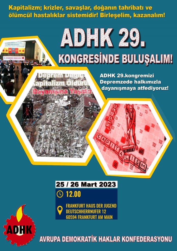 ADHK (Avrupa Demokratik Haklar Konfederasyonu) 29. Olağan Kongresini ‘’Kapitalizm; krizler, savaşlar, doğanın tahribatı ve ölümcül hastalıklar sistemidir. Birleşelim Kazanalım’’ şiarıyla 25 - 26 Mart 2023 tarihleri arasında Frankfurt Haus der Jugend Salonunda gerçekleştirecek.