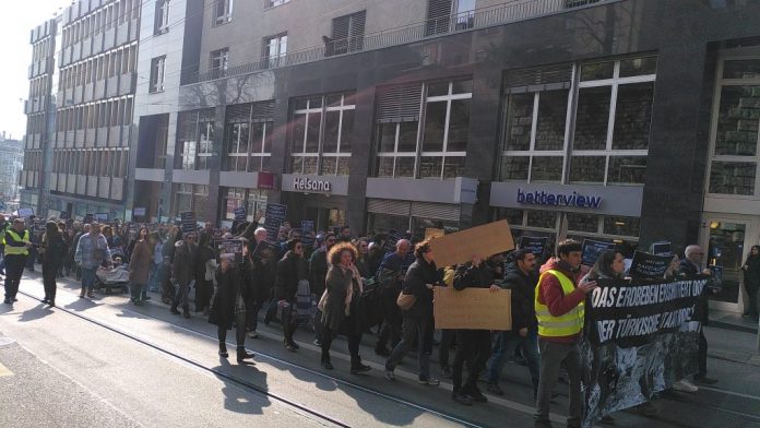 Türkiye, Kurdistan ve Suriye kentlerinde 6 Şubat’ta gerçekleşen deprem sonrası Türk devletinin ölüme terk eden politikaları, demokratik kitle örgütleri tarafından İsviçre’nin Zürih kentinde protesto edildi.